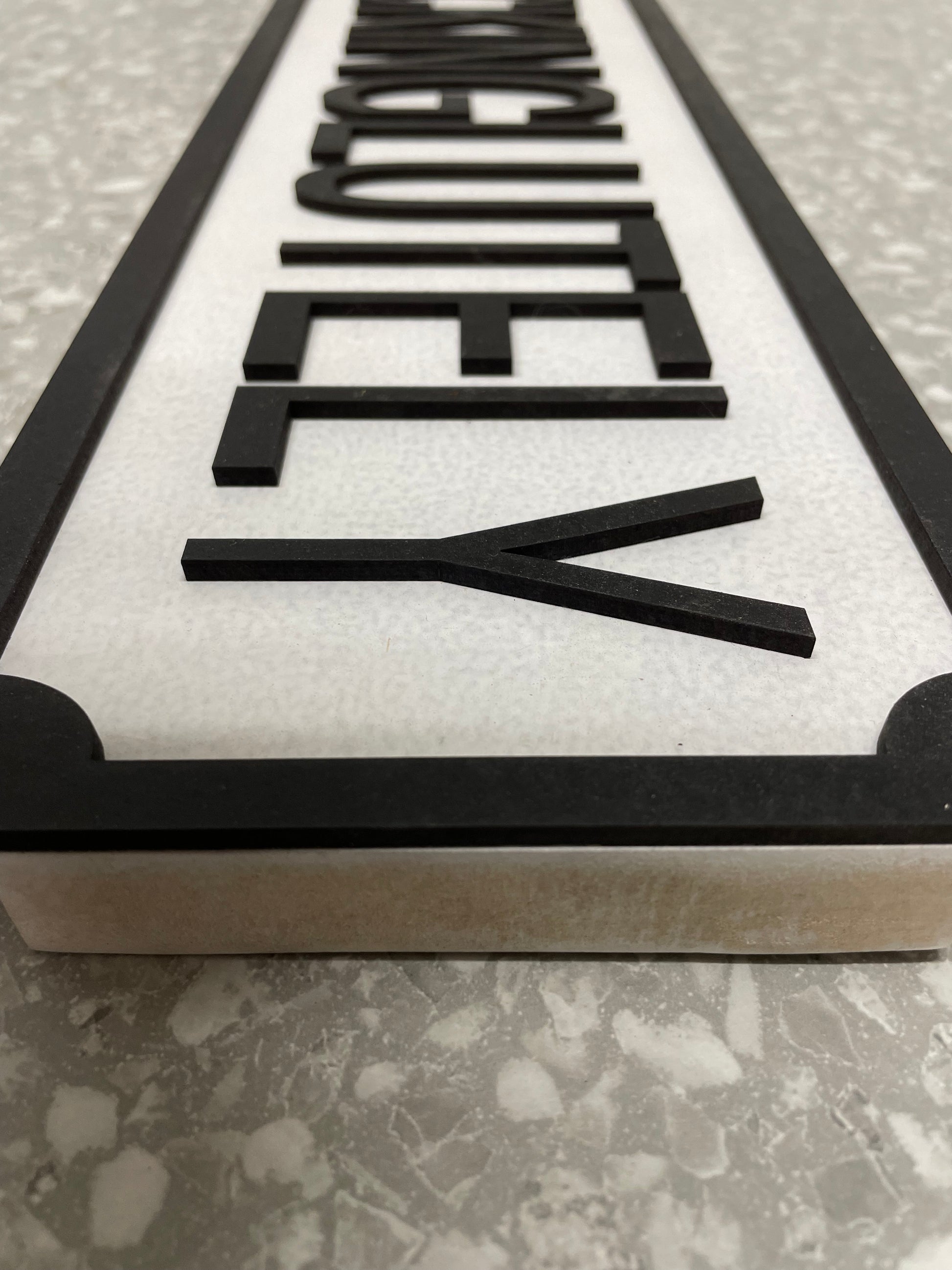 Handmade vintage replica street sign in black and white.